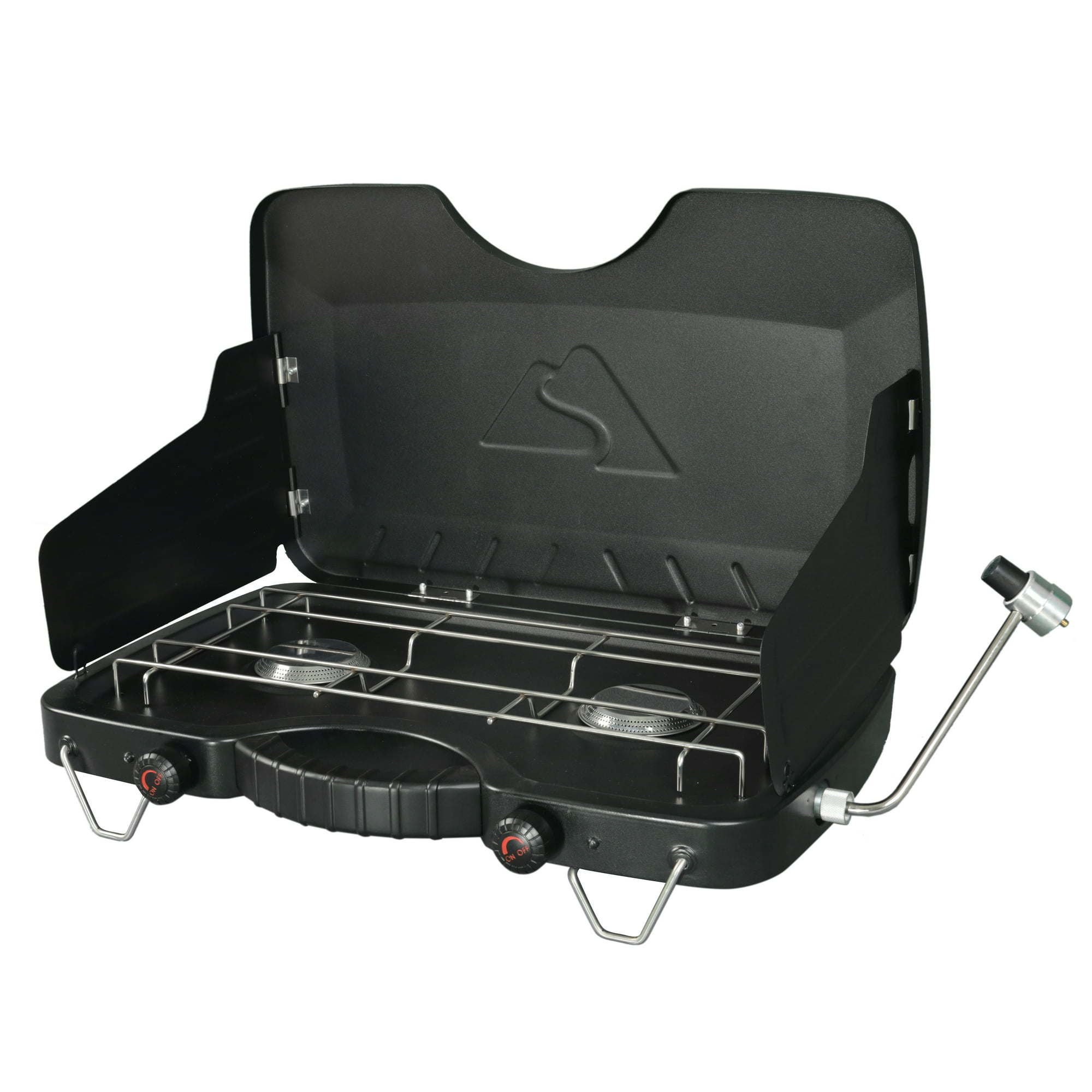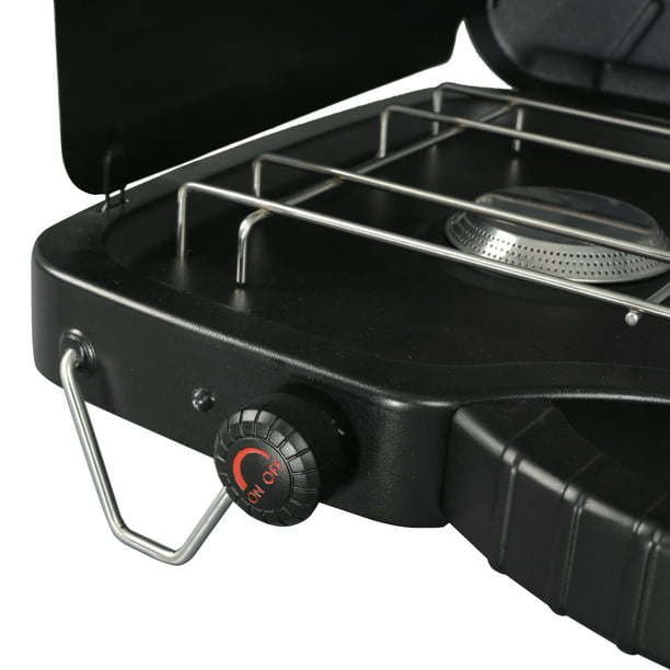 2 Burner Propane Gas Camping Stove, Black, GCT2208WVersatile camp stove equipped with two 10,000 BTU stainless steel burners (3.15" each)Dual-burner propane stove is suitable for use when camping or without electricityUse to prepare chili, soup, eggs and other campsite favoritesBuilt-in wind guards keep the flame strong even during suboptimal weather conditionsPowerful design that runs for up to 1 hour with a 16-oz cylinder propane canisterVery easy to useNice gift idea for any outdoor enthusiast"