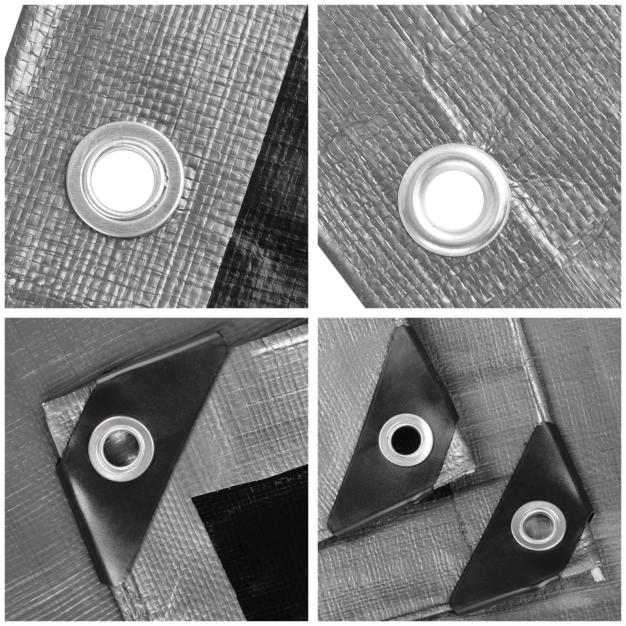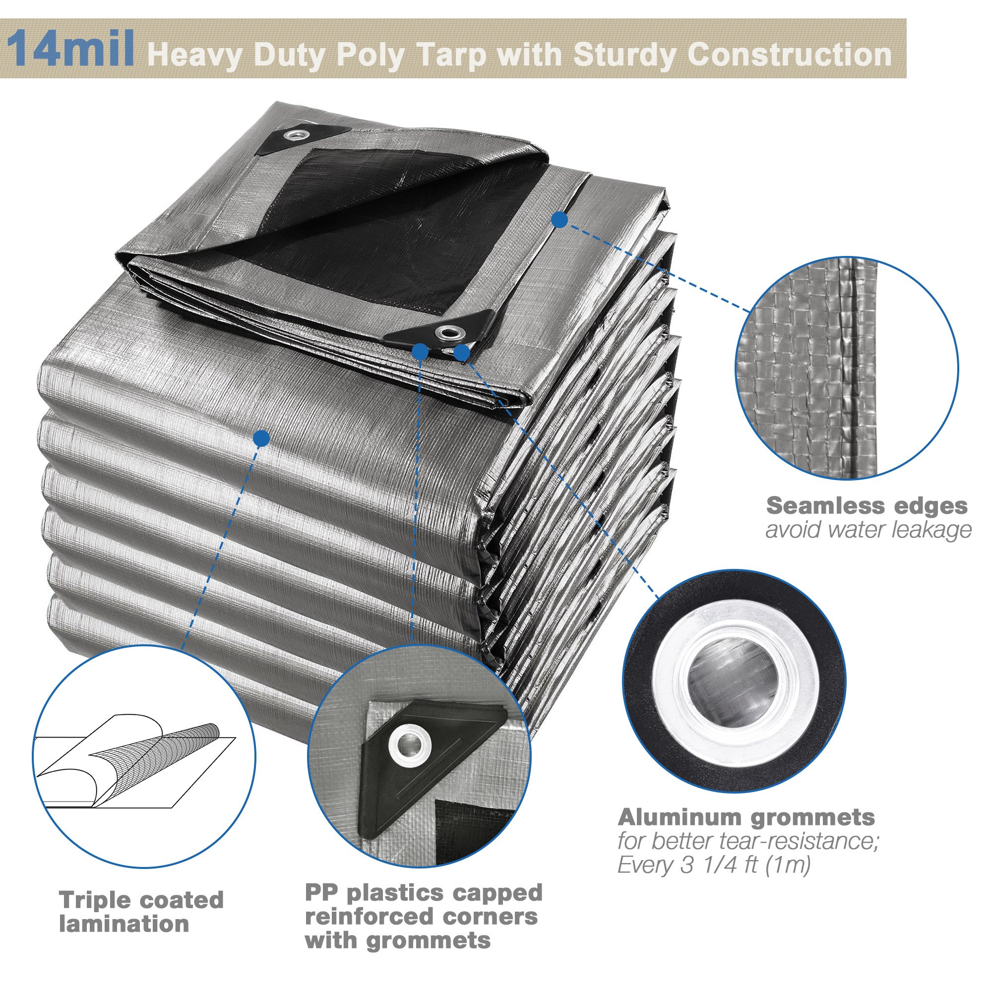 - Sturdy Poly Tarp - 14mil extra heavy-duty thickness and aluminum grommets in 3 1/4 ft (1m) interval for better tear-resistance; weights 54.08Lbs; PP plastics capped reinforced corners with grommets for sturdy construction; All seamless edges avoid water leakage
