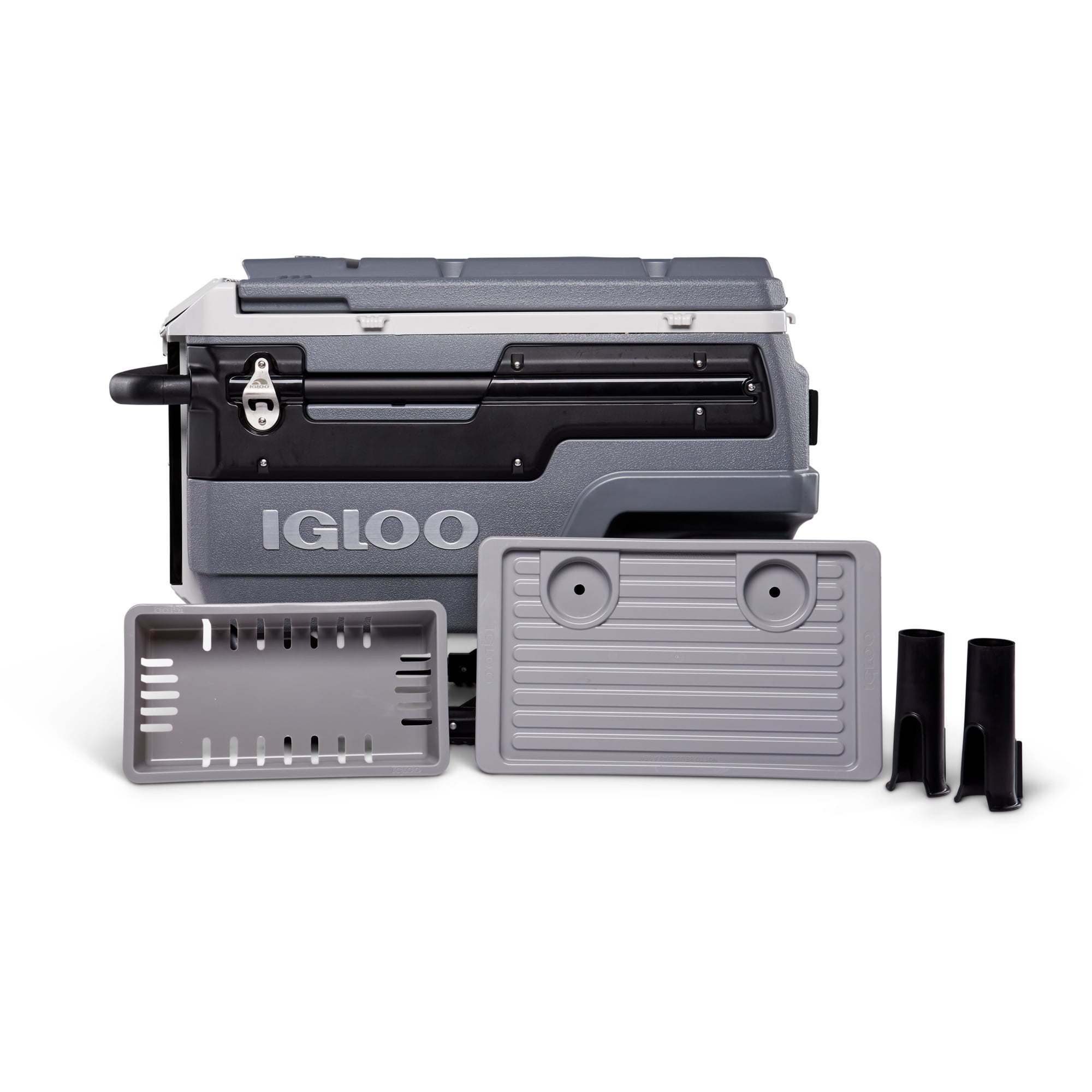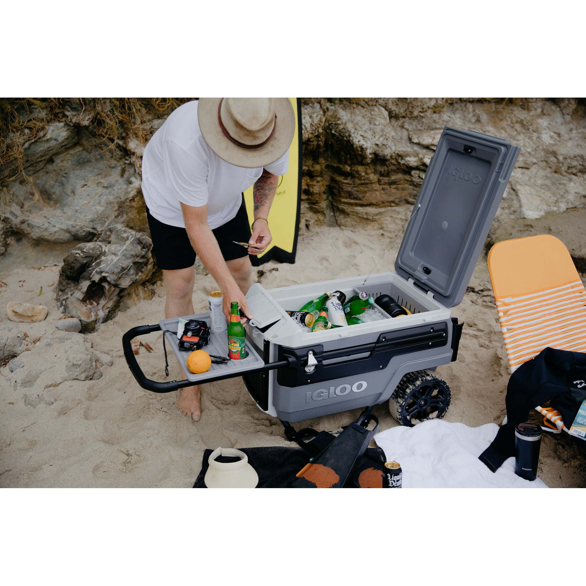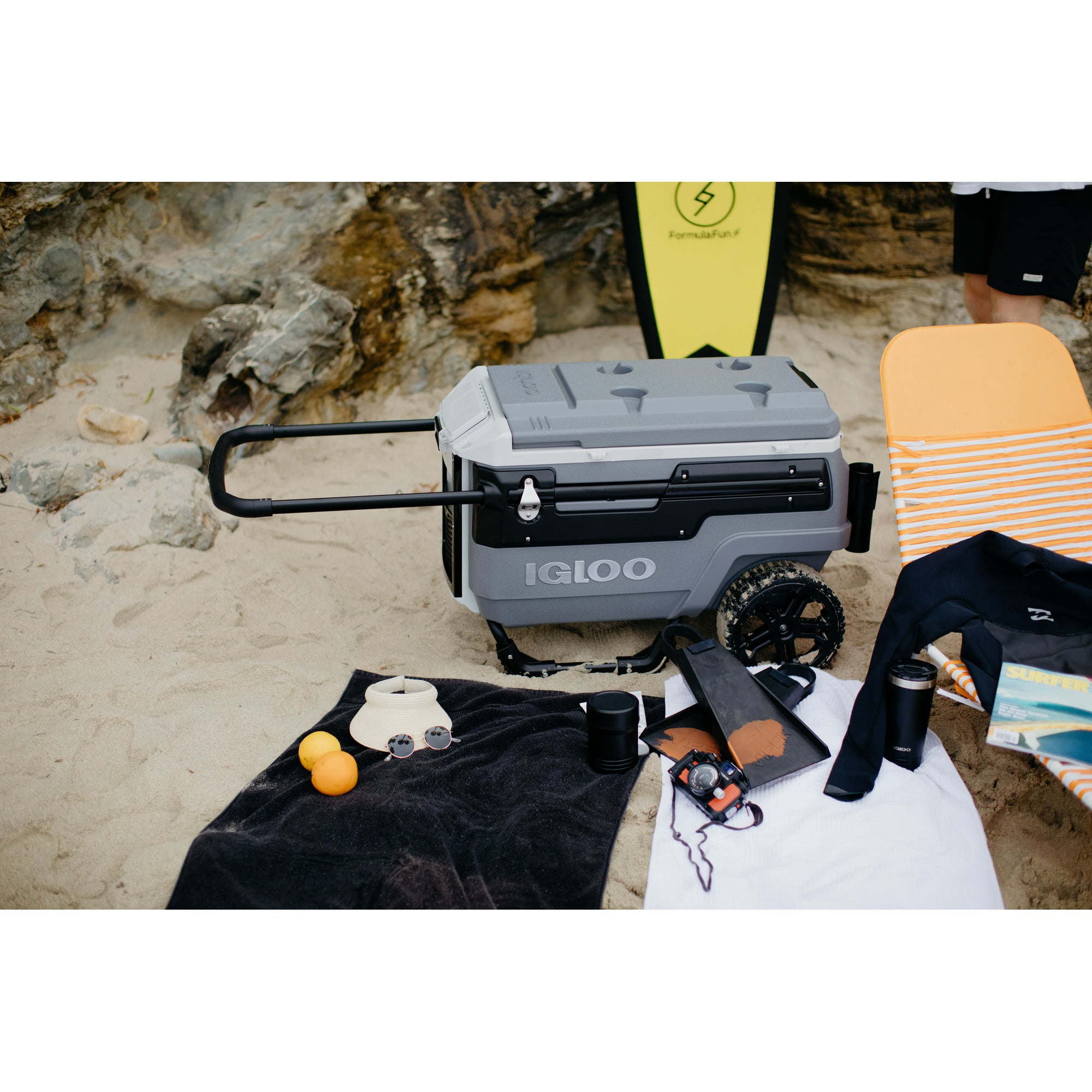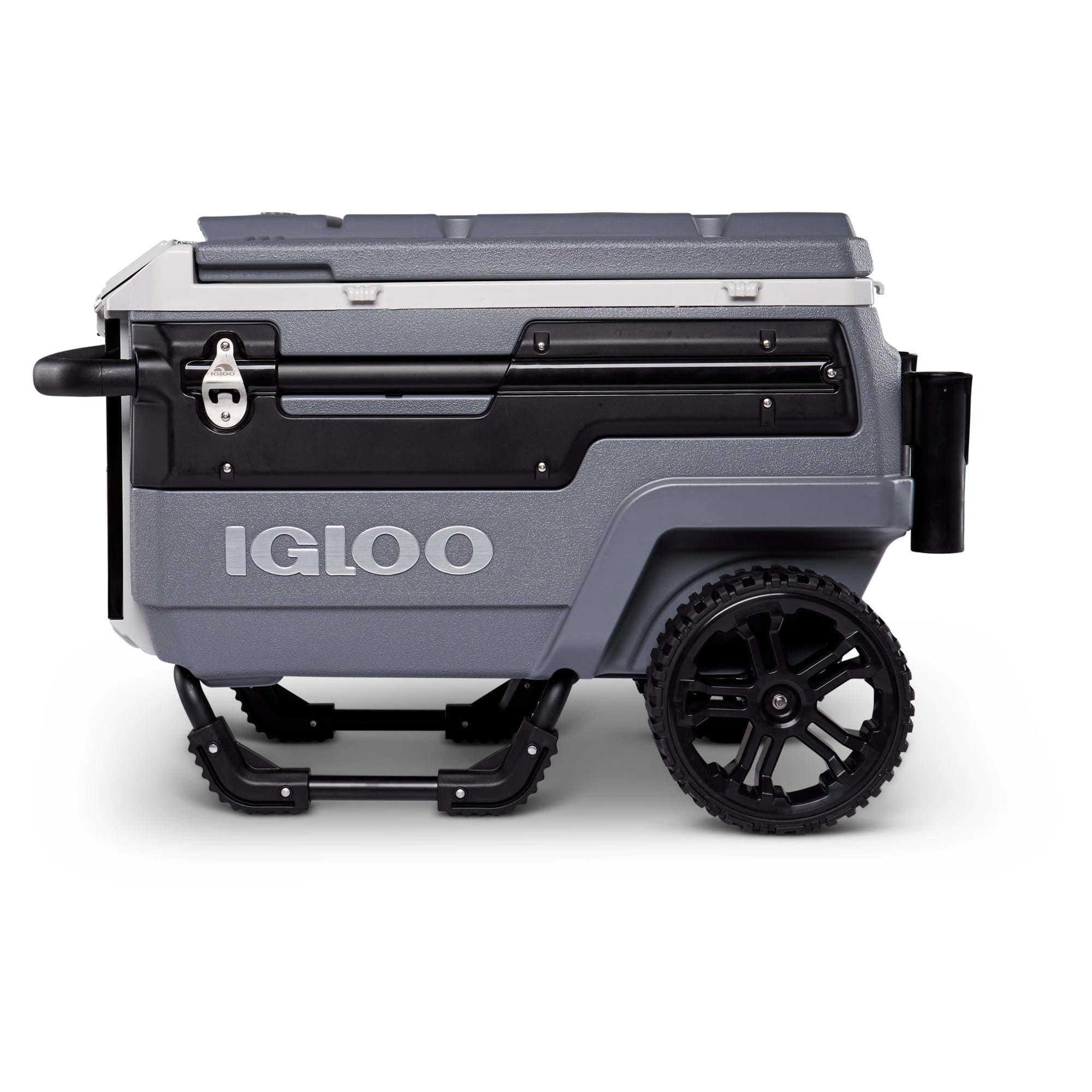 Product DetailsWith the 70-qt, it's loads of fun. We built the cooler so it can roll over rough terrain as much as it does paved trails. It's packed with tons of handy features—all-terrain smooth wheels, telescoping handle, thermecool insulation, bottle opener, storage area, and more—so you can get where you're going with ease and provide everyone throughout your adventure Serves iced items.Tackle sand and other challenging terrain with the superior traction and ground clearance of 10-inch, never-flat, smooth-riding wheelsPulling your load is 50% easier thanks to the comfort and leverage of our horizontal dual trigger steel Glide handle with locking and telescopingA cleaner, environmentally friendly insulation that provides excellent ice retention in the body and coverTechnology improves cooling performance by elevating cooler body away from hot surfacesTie-down hooks (use bungee or cord, not included) give you more carrying options, allowing you to easily haul items like towels, quad chairs or surfboards to your destinationLockable waterproof storage compartment features a leak-proof gasket to keep pocket-sized essentials like your phone or sunglasses handy and dryThreaded drain plug is garden hose compatible and features a non-slip, easy-grip tether coverRemovable butler's tray rests on telescoping handle, provides ideal space for serving food and drinks (stores under lid when not in use)Hanging interior food basket keeps selected foods dryStore items like sunscreen, bug spray or books in the exterior storage pocketTwo rod slots for beach umbrellas or fishing rodsDedicated slot on the cover holds your mobile device upright for easy viewingFour self-draining cup holders in the lid keep your drinks safe and within easy reachTwo built-in stainless steel corkscrews help you enjoy bottled beverages quickly and easilySlide rails have anti-rust coatingEnjoy durability in the details with high-quality stainless steel rust-resistant screwsSpacious 70-quart capacity holds up to 112 cans