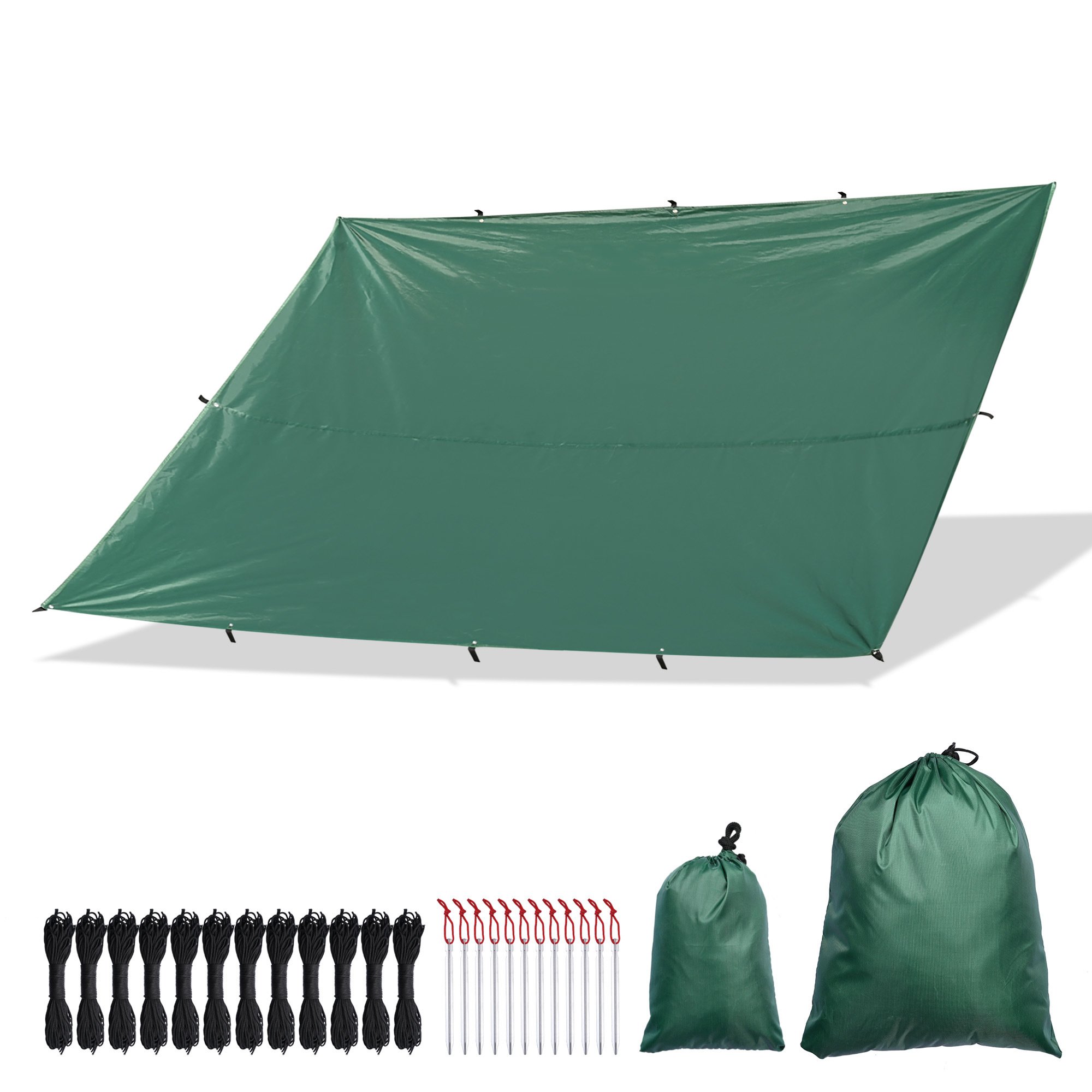 - Complete Accessories - Everything you need for tarp installation is included in the package, including 12 aluminum alloy stakes, 12 guy lines and 2 carrying bags