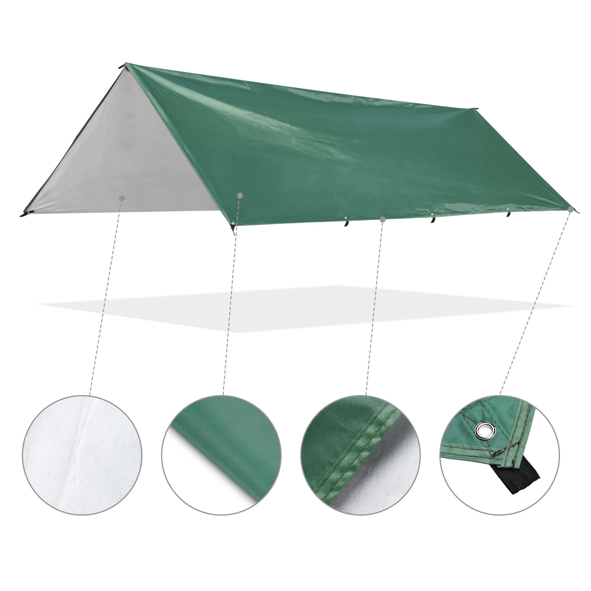 - UV Protection & Water Resistance - Made of 210D oxford fabric with silver PA coating, the tarp offers UV50+ protection for protecting you from sunlight, avoiding sunburn and reducing temperature in hot summer; shelter with PU3000mm water resistance is suitable for using on drizzling days; durable material ensures wear resistance and tear resistance for frequent use