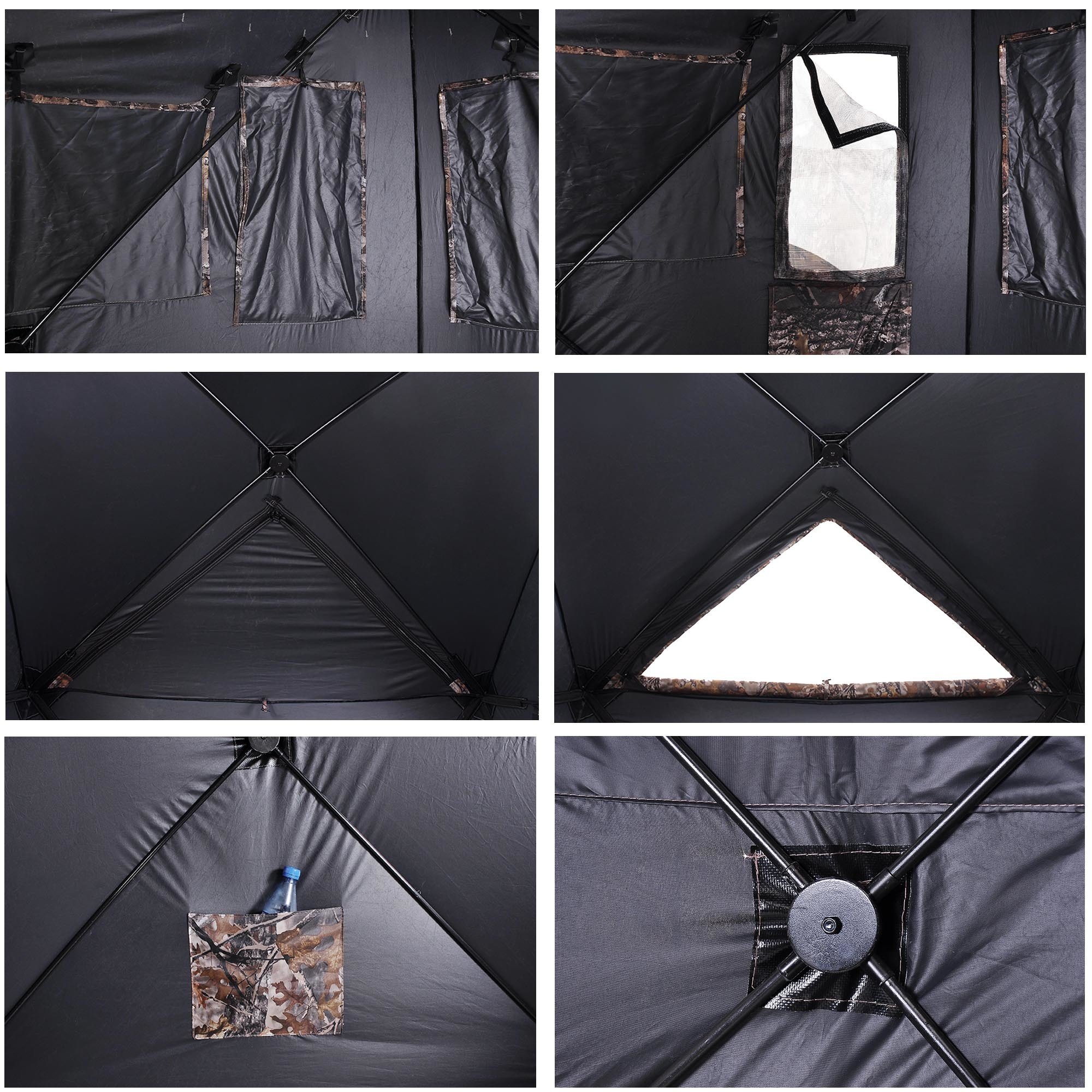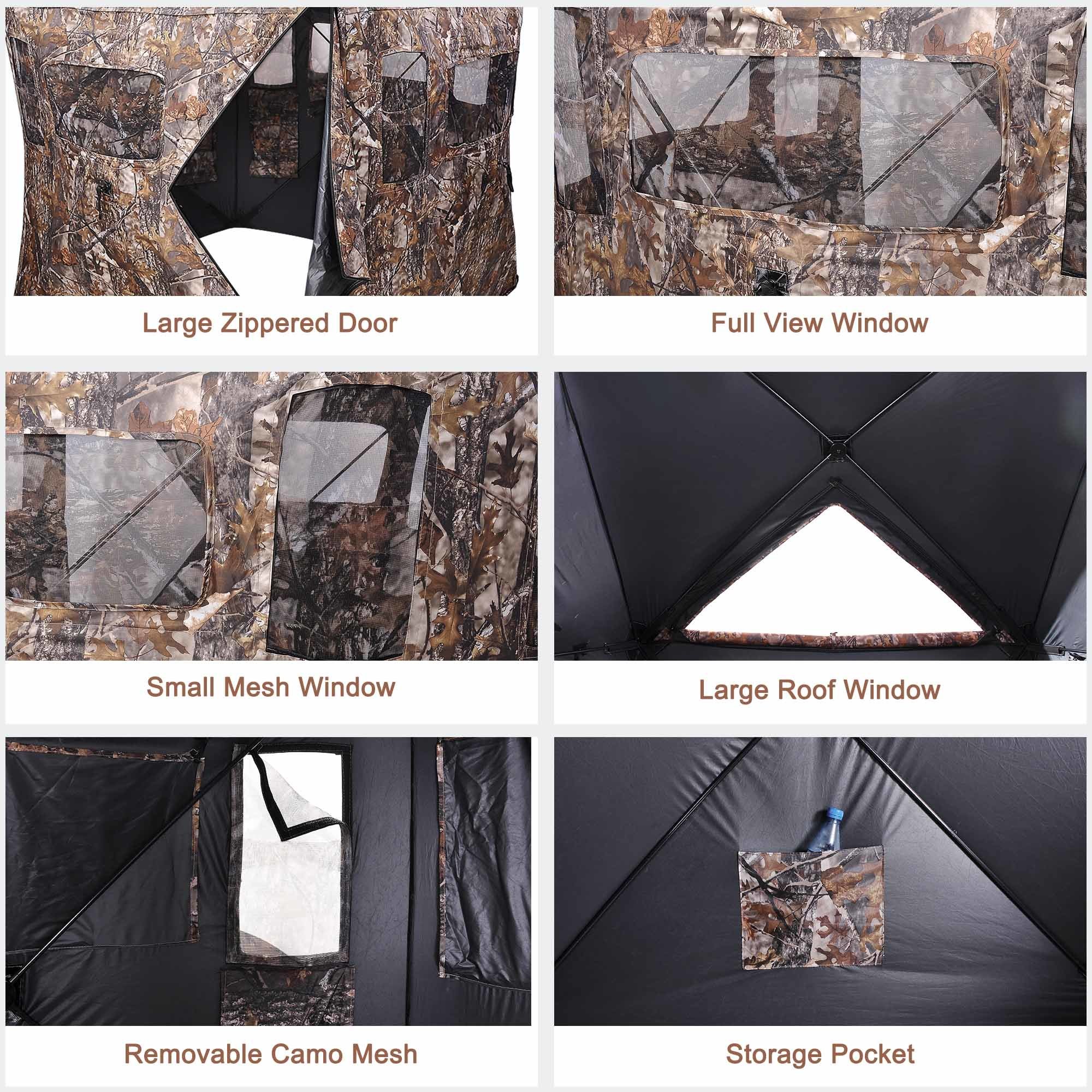 Mesh Windows & Zippered Door - 4 Full view windows for improving visibility of observation and increasing hunting success; 7 small windows for easy shooting through; 1 large roof window for increasing shooting angles; mesh windows are beneficial for air ventilation; large zippered door for easy to entry or exit