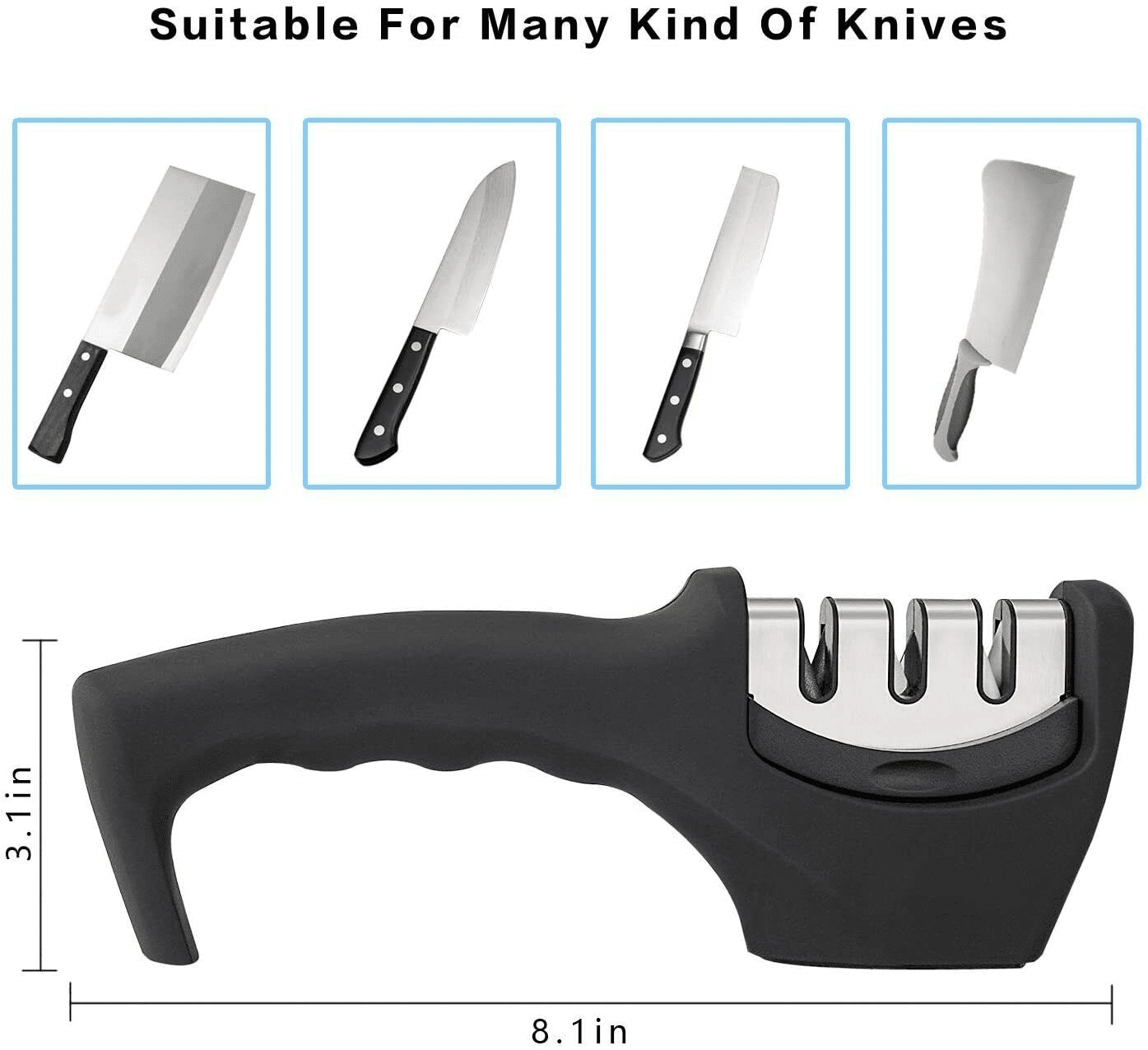 Easy to Handle! Simply place the dull blade in one of the Sharpener slots and quickly pull the knife through times for effective sharpening.Our sharpening system is your best choice!