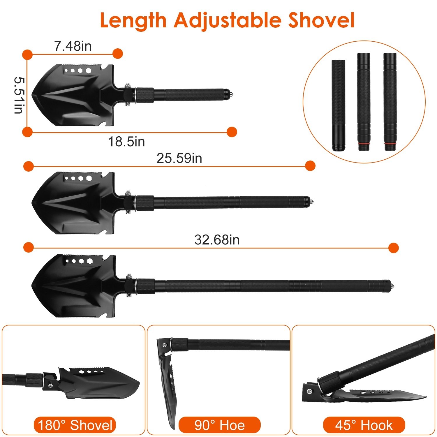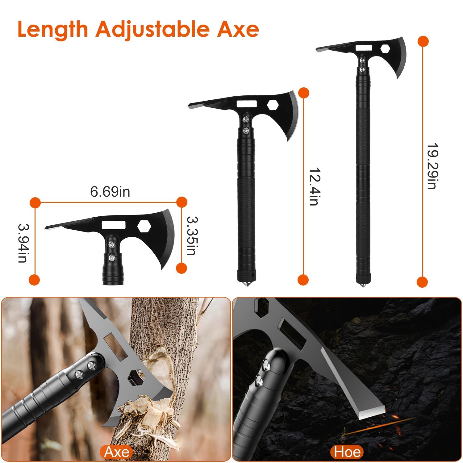2.Shovel can be assembled from 18.5in to 32.68in in length and the axe can be assembled from 3.94in to 19.29in