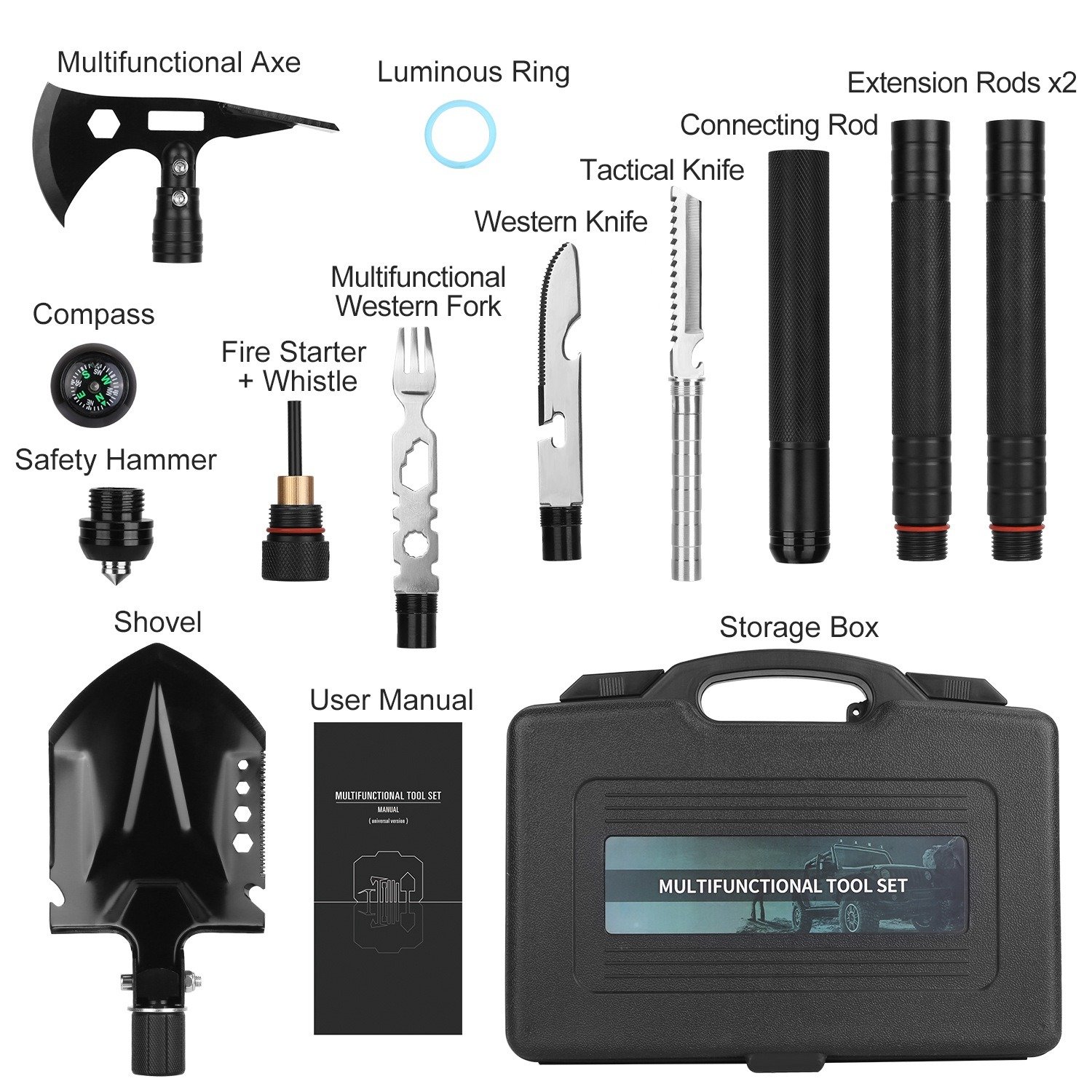1.Including Multifunctional Shovel, Axe, Compass, Tactical Knife, Western Knife, Western Fork, Fire Starter, Whistle, Safety Hammer