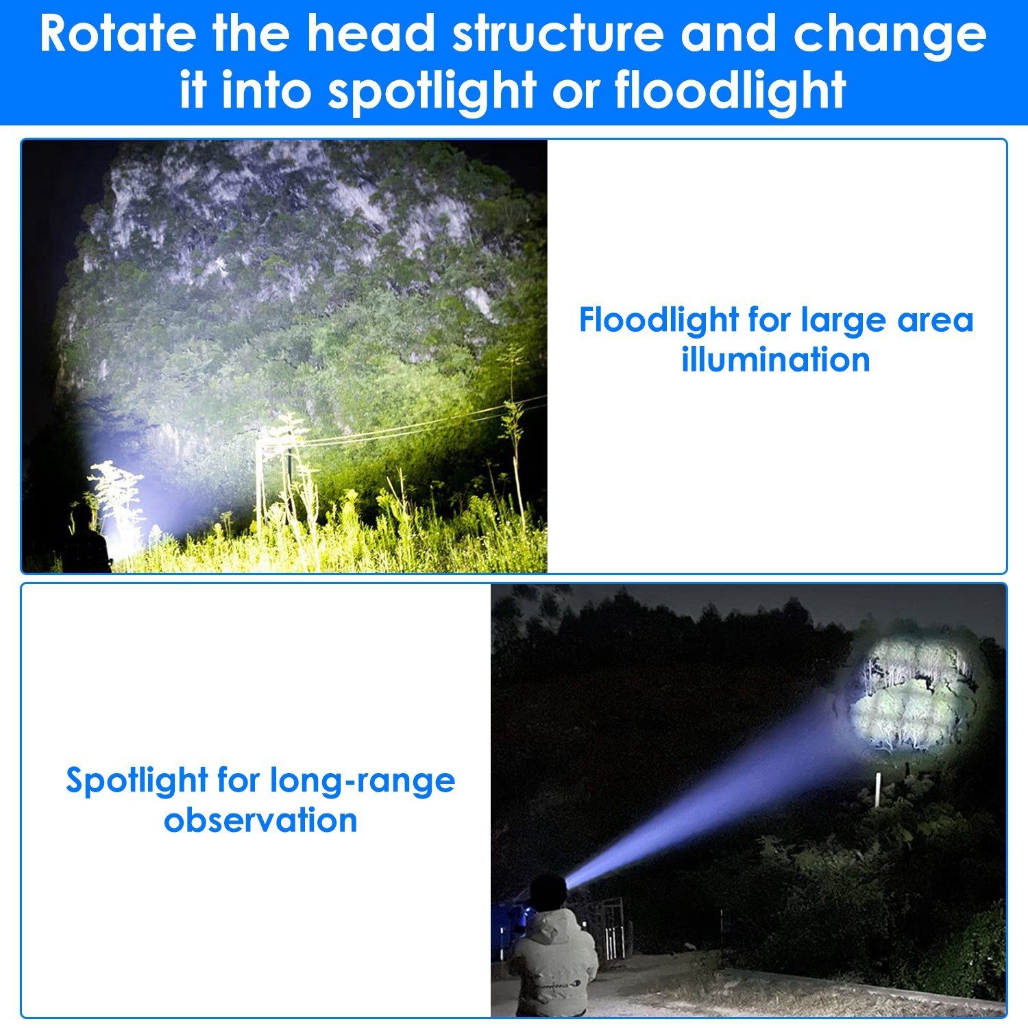 *Retractable Flashlight*:You can zoom the light in and out by pulling the head. If you rotate the head; the light will become clear and in different shapes. You can change it into spotlight for long-range observation or floodlight for large area illumination. It is suitable for camping; hiking; repairing or an outage.